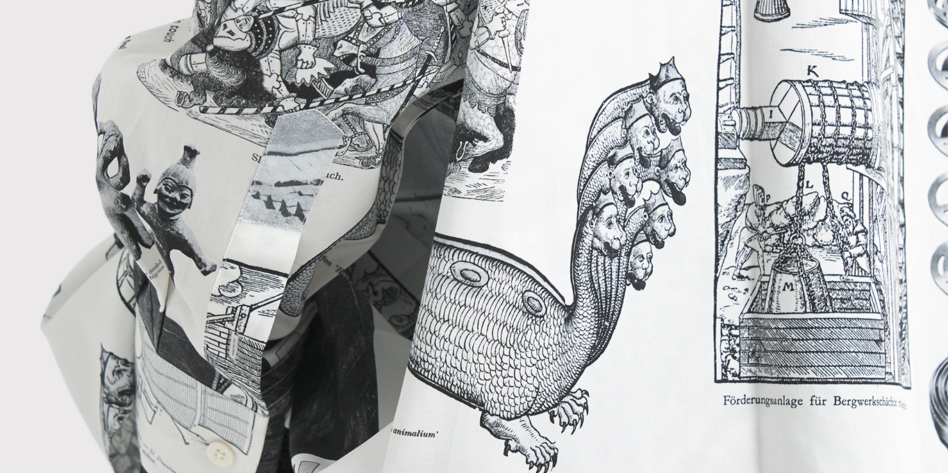 La collection présente des images d'archives liées aux notions de centre-ville et de cité sous forme de motifs placés, d'impressions en all-over, d'appliqués, de broderies et de gravures au laser. Cette approche du vêtement renvoie à la démarche plastique de Suter dans son travail de l’affiche, tandis que les motifs récurrents de formes labyrinthiques et de dragons en bas-relief suggèrent une nouvelle mythologie contemporaine.