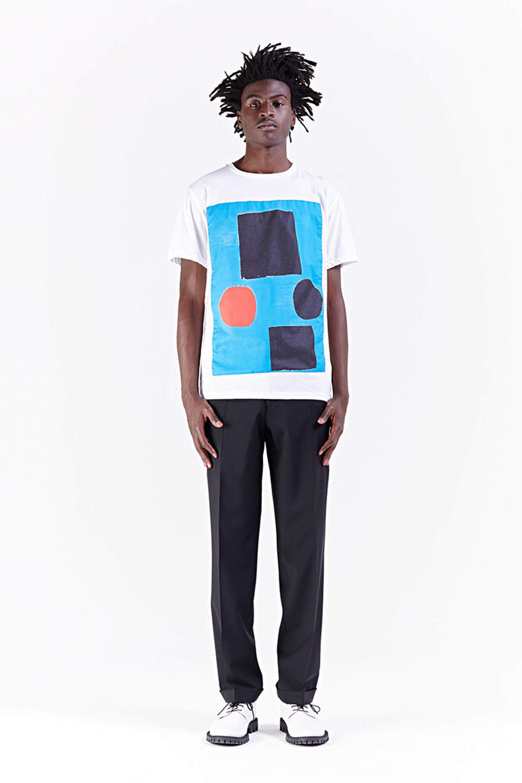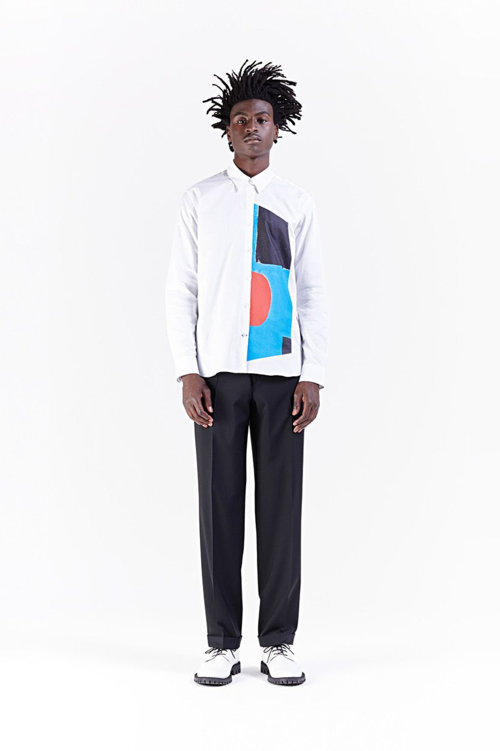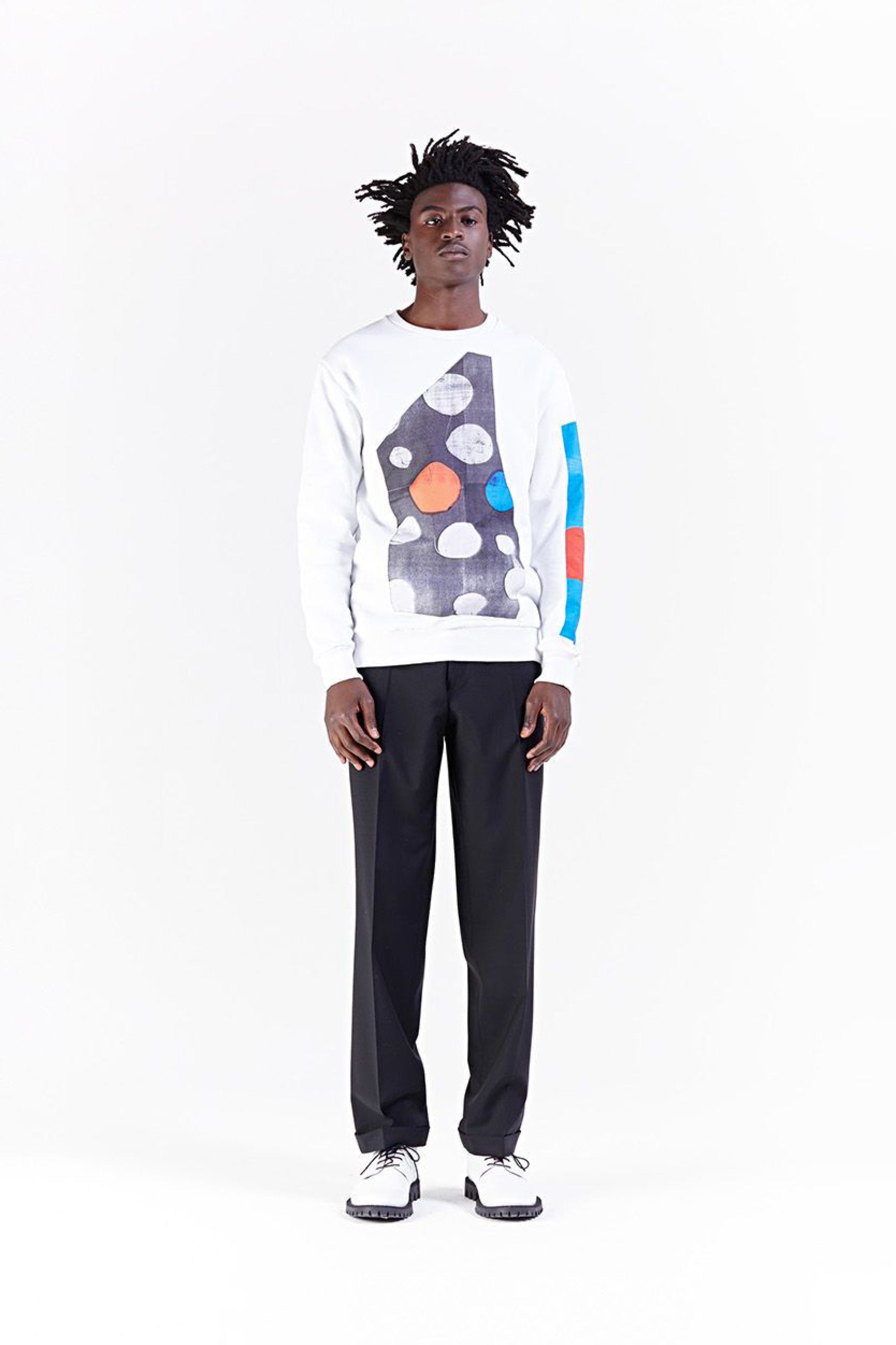 En partenariat avec le duo d'artistes Adrien Horni et Linus Bill, l'intervention de patchworks de sérigraphie à grande échelle se superpose aux costumes et aux vêtements de dessus, ce qui permet d'obtenir une sensibilité artisanale alors que des échantillons irréguliers se détachent des surfaces planes.