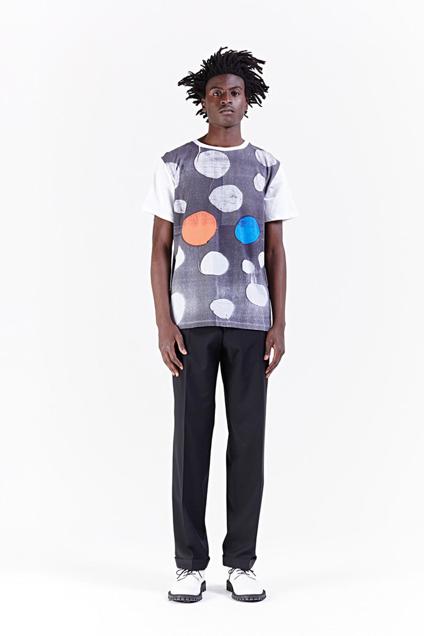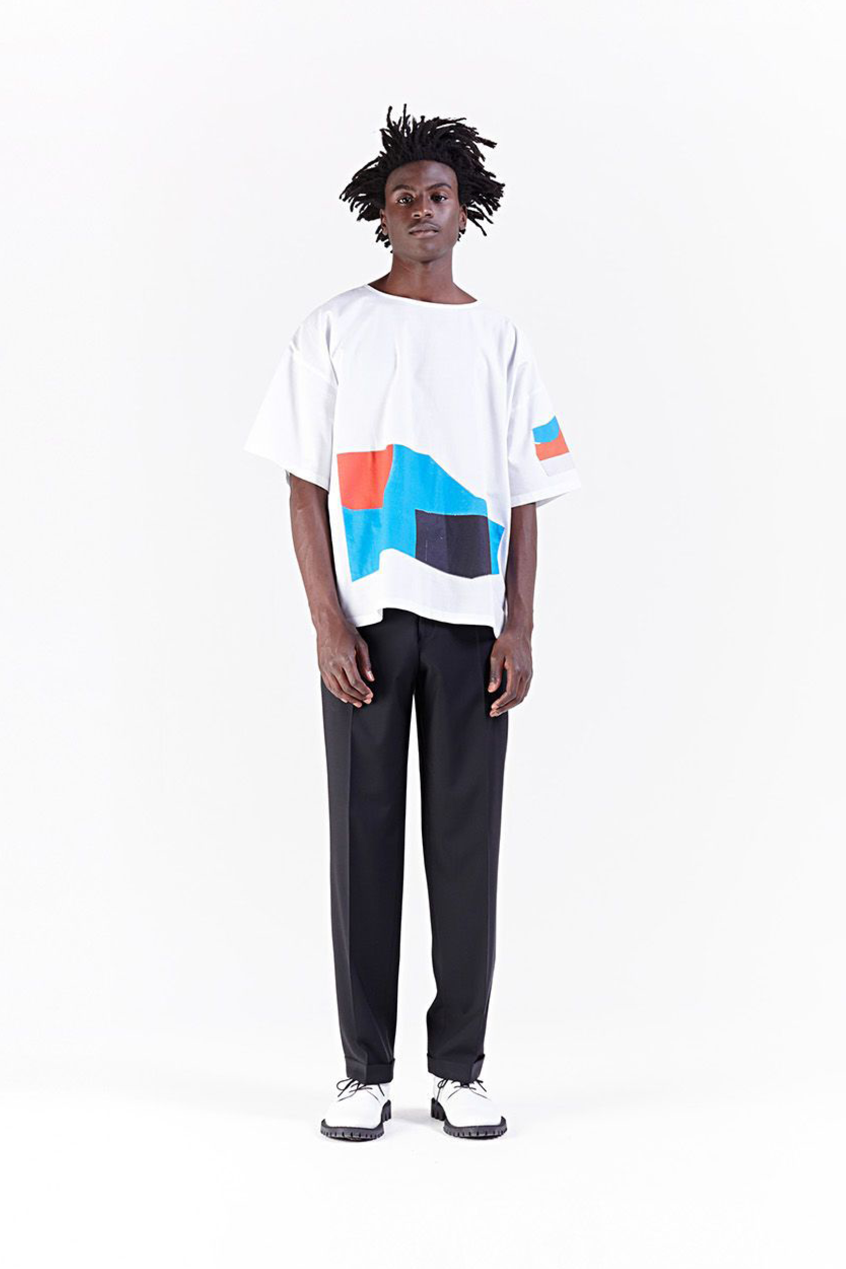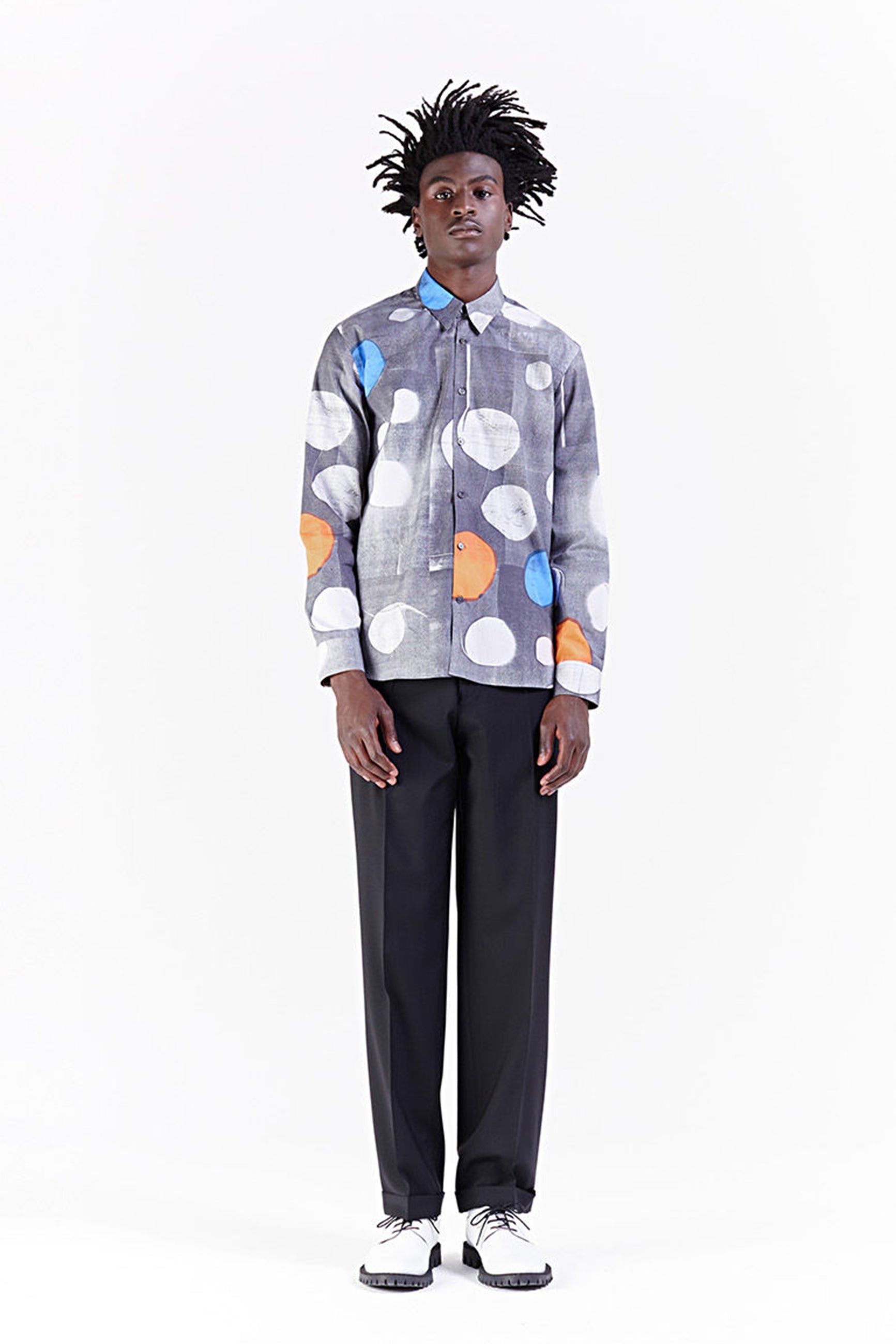 En partenariat avec le duo d'artistes Adrien Horni et Linus Bill, l'intervention de patchworks de sérigraphie à grande échelle se superpose aux costumes et aux vêtements de dessus, ce qui permet d'obtenir une sensibilité artisanale alors que des échantillons irréguliers se détachent des surfaces planes.