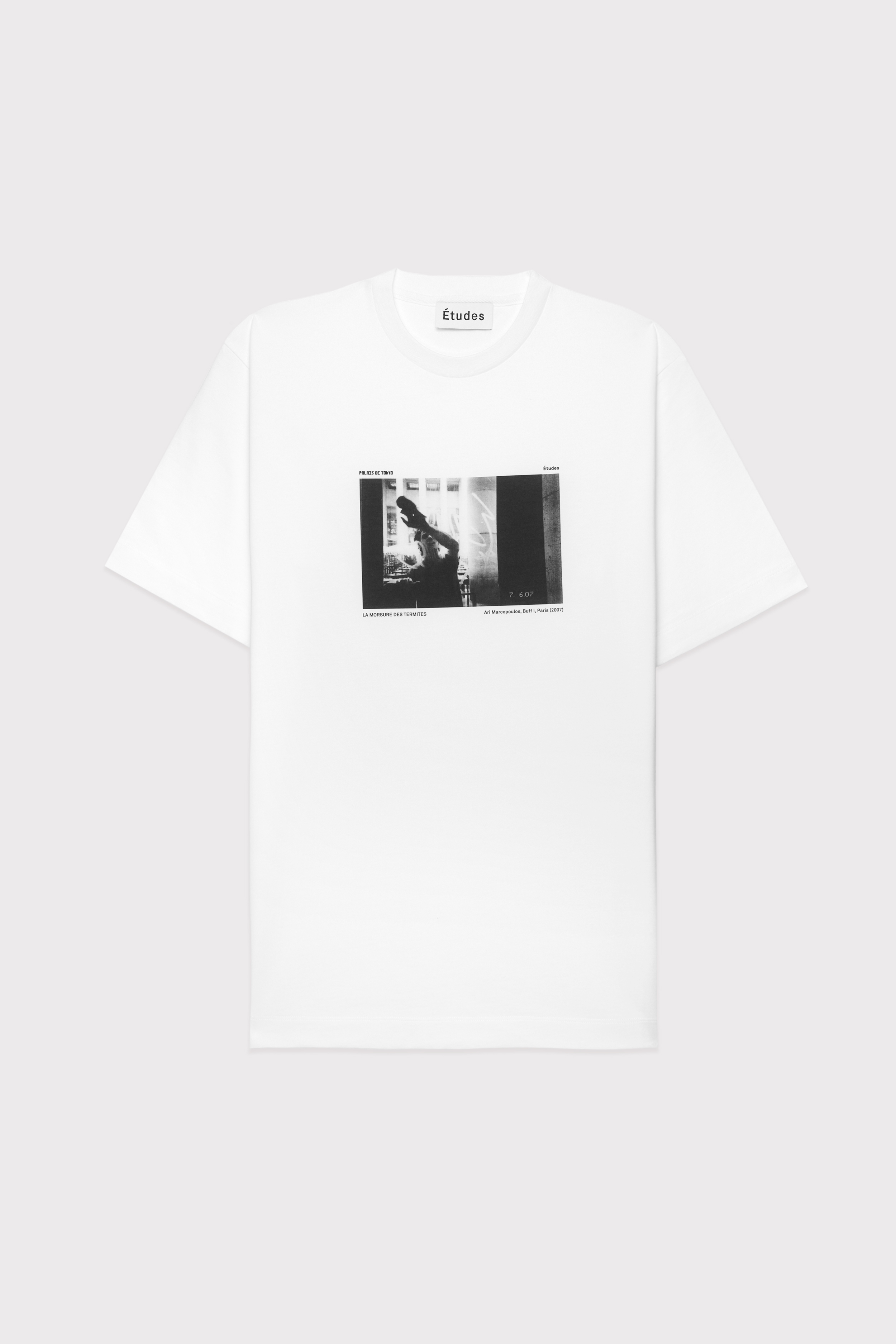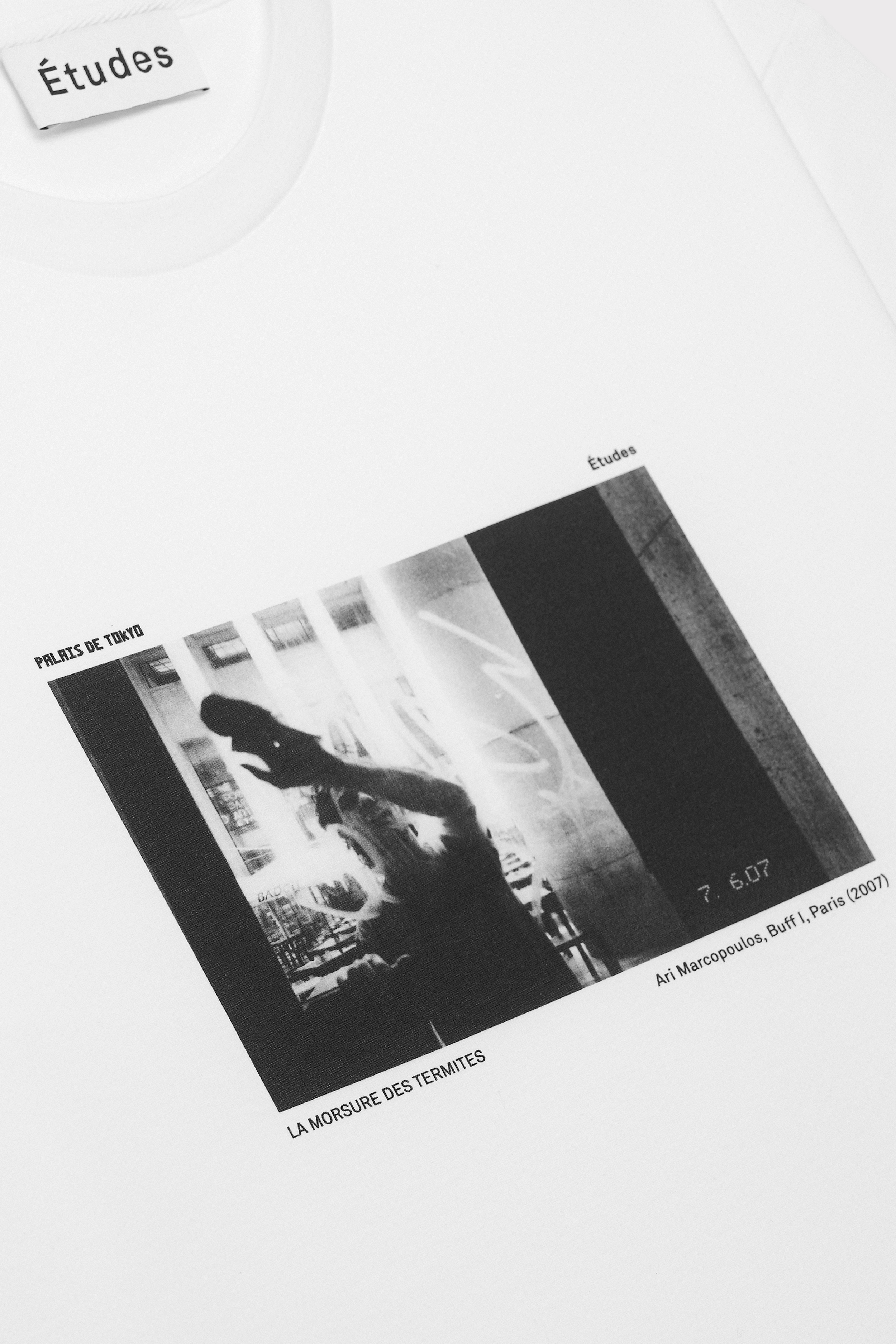En 2023, à l’occasion de l’exposition La morsure des termites au Palais de Tokyo, Études Studio s’associe au photographe new-yorkais Ari Marcopoulos – ami de longue date de la marque et objet d’une monographie publiée en 2017 – pour imaginer un tee-shirt orné de Buff I, l’un de ses clichés emblématiques.