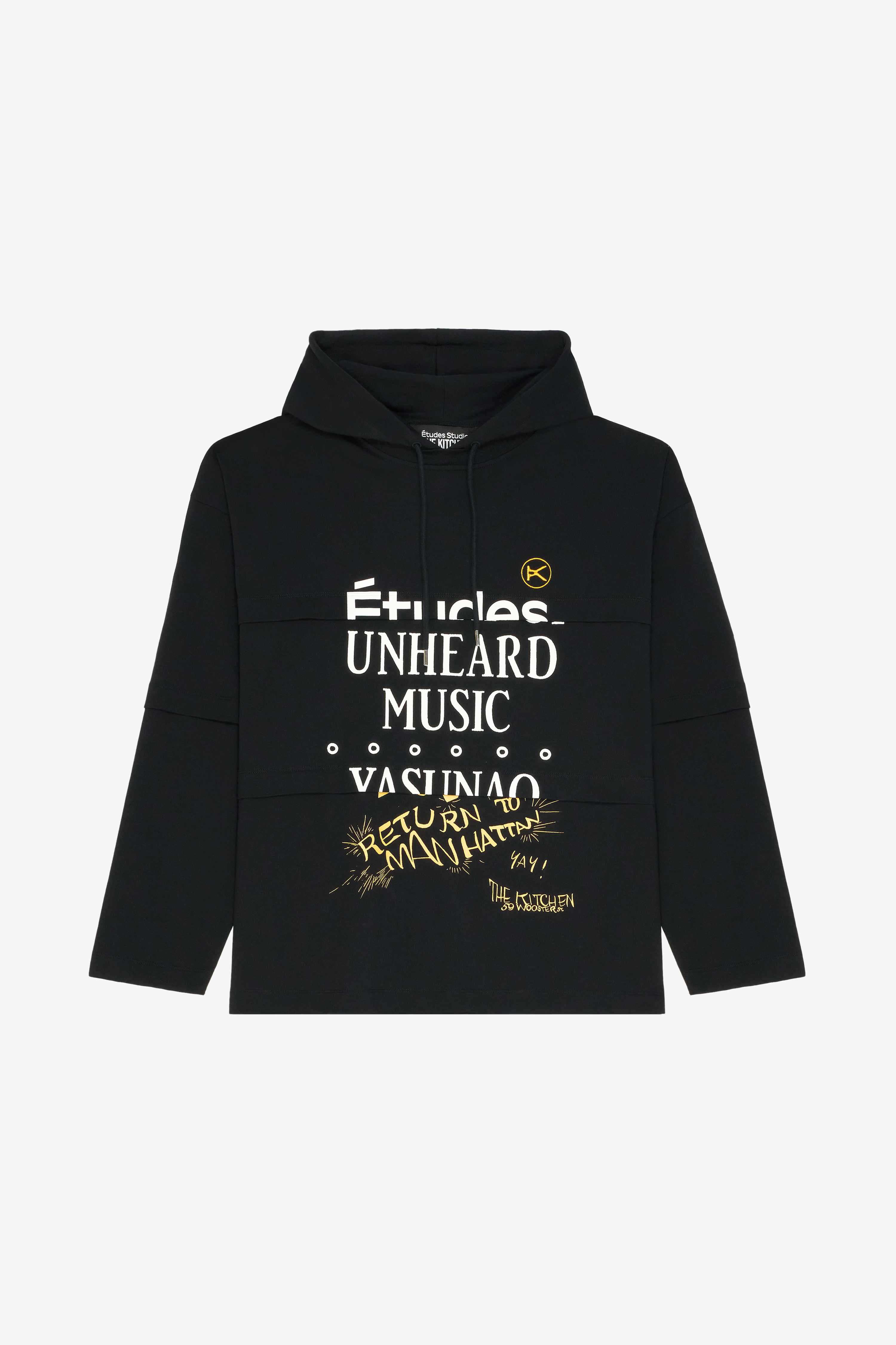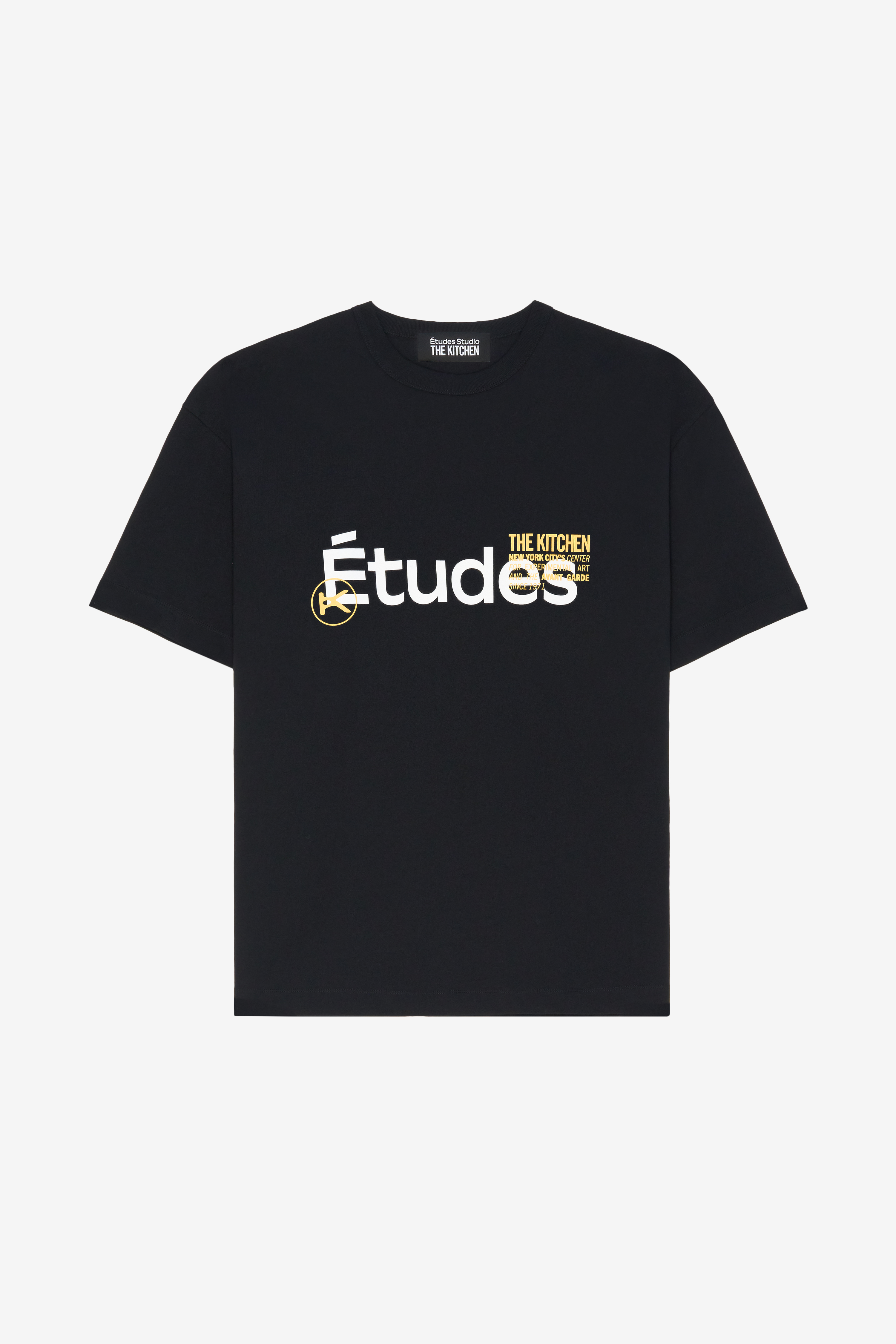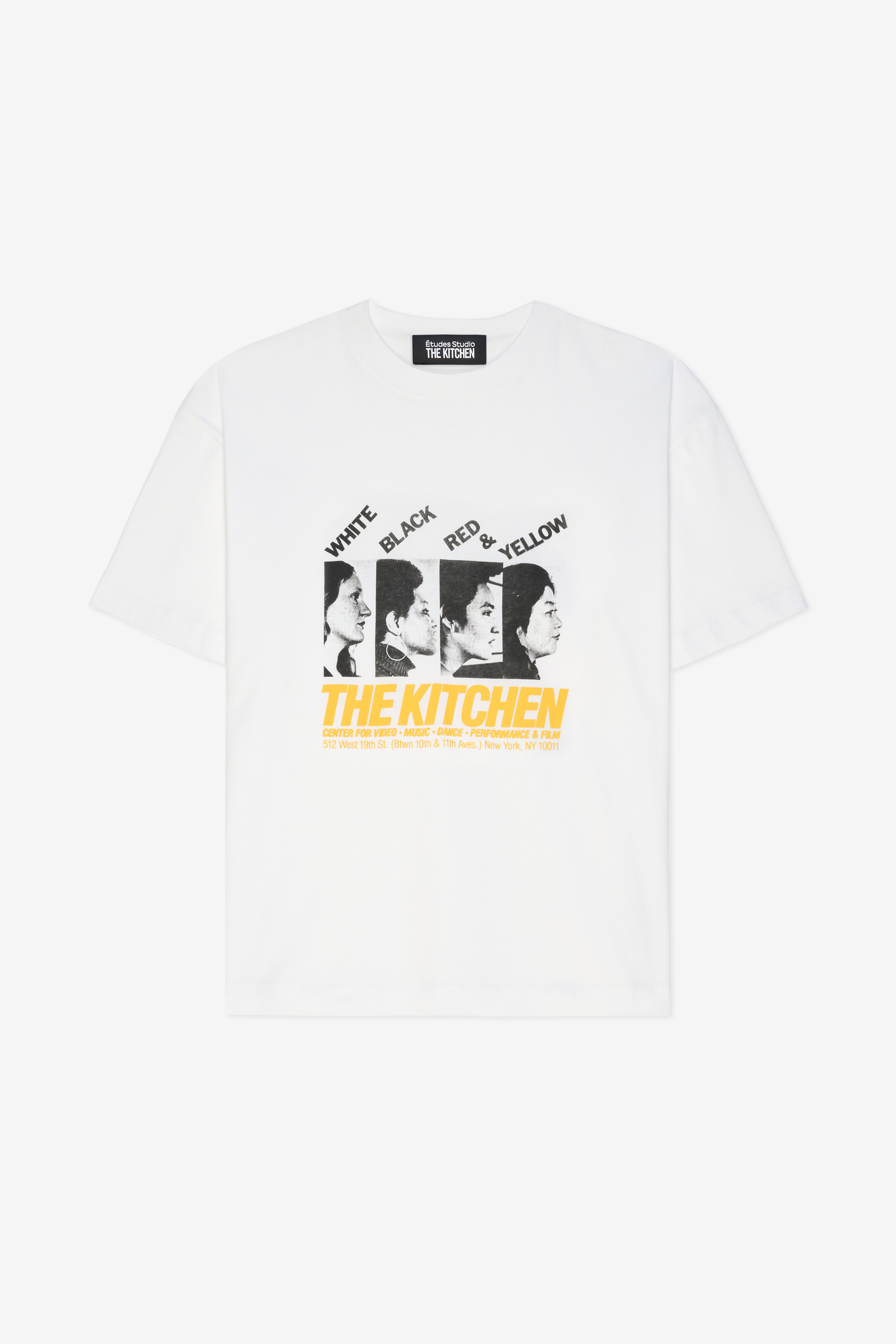 This capsule collection mixes works by different artists, reflecting the collaborative spirit of Études Studio and the multidisciplinary nature of The Kitchen. This experimental creative hub, dedicated to staging the global avant-garde, inspires contemporary pieces that celebrate moments of rare artistic freedom. With a predominance of black and white, enhanced by touches of yellow, the collection features archival images, references to performances and poster details.