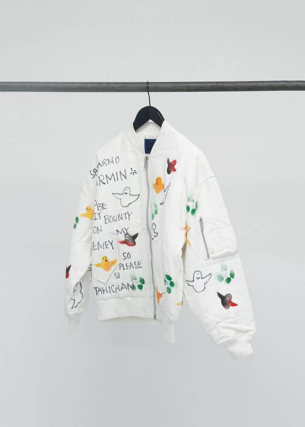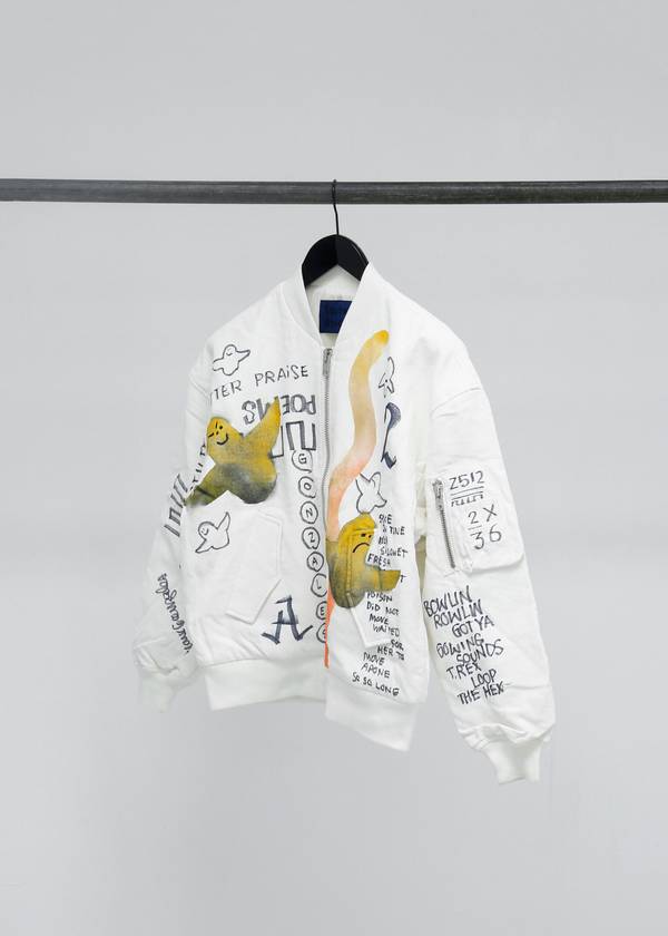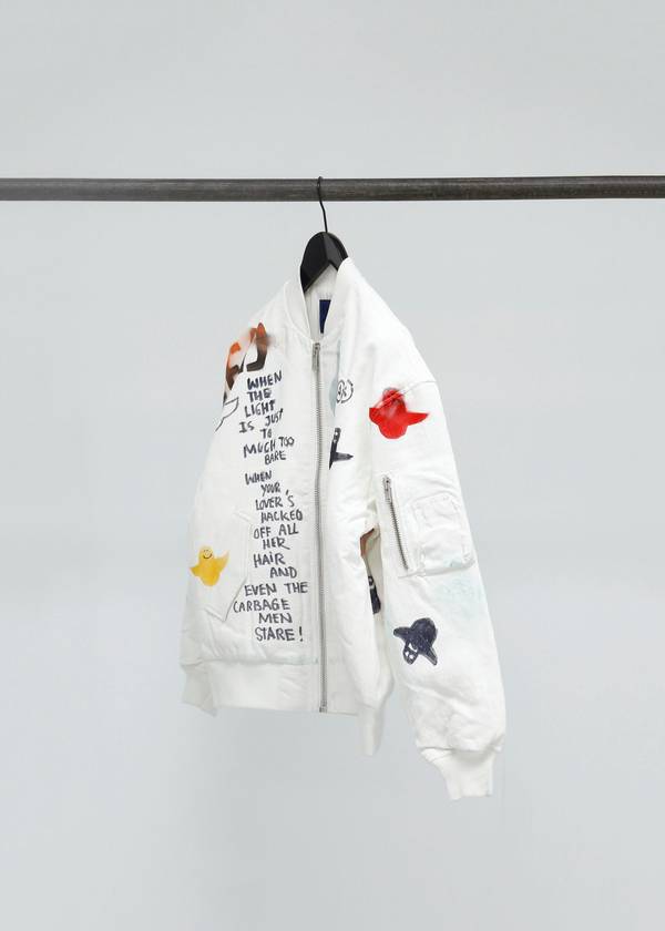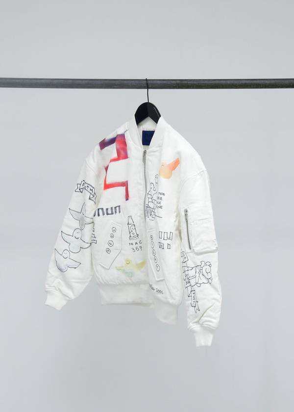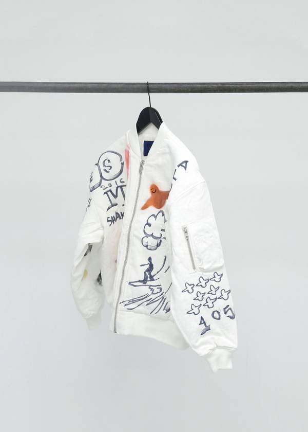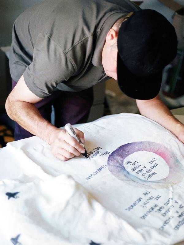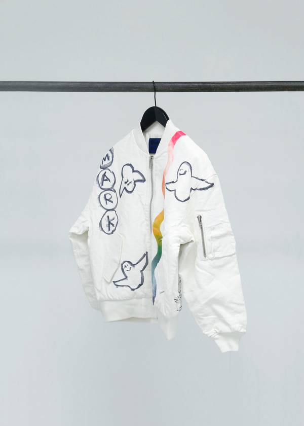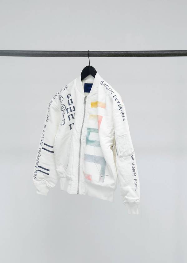 The capsule collection consists of the classic Info shirt and October tote bag in three styles with three artworks created exclusively for Études Studio by Mark. In spirit of N°8, a small publication will be produced consisting of Mark’s poetry and artwork. Finally, a series of customized, one-of-a-kind, Horizon bomber jackets and Sesam hats created by Mark will be available in highly limited quantities.
