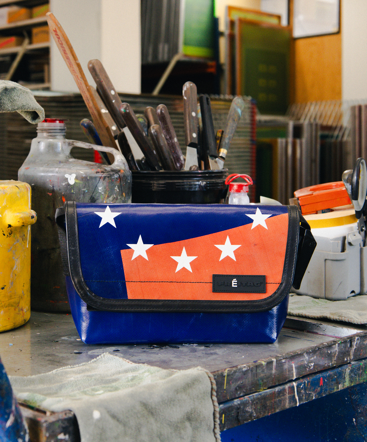 Études Studio joins forces with Zurich-based FREITAG for a limited-edition collaboration that bridges functional design and visual expression. Rooted in shared values of sustainability and urban creativity, the iconic FREITAG F41 HAWAII FIVE-0 messenger bag is reimagined through Études Studio’ graphic lens. Made entirely from repurposed truck tarps in curated shades of blue, each bag is unique, shaped by the road, marked by time. Études Studio’ signature stars are screen-printed onto the surfaces, turning every piece into a singular object where raw utility meets artistic gesture.